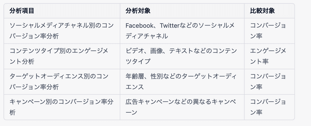 以下は、ソーシャルメディアマーケティングにおけるクロス分析を行う際の比較・分析対象の一例となっています。