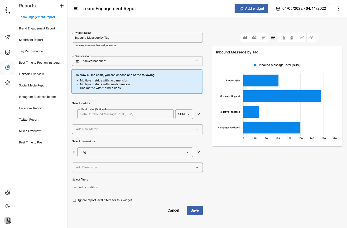 Statusbrewで全てのチャネルにおいて、「重要視するエンゲージメントなどの分析指標」を自由に加工して計算するだけではなく、グループ化した分析結果だけのデータウィジェットも作成することができます。