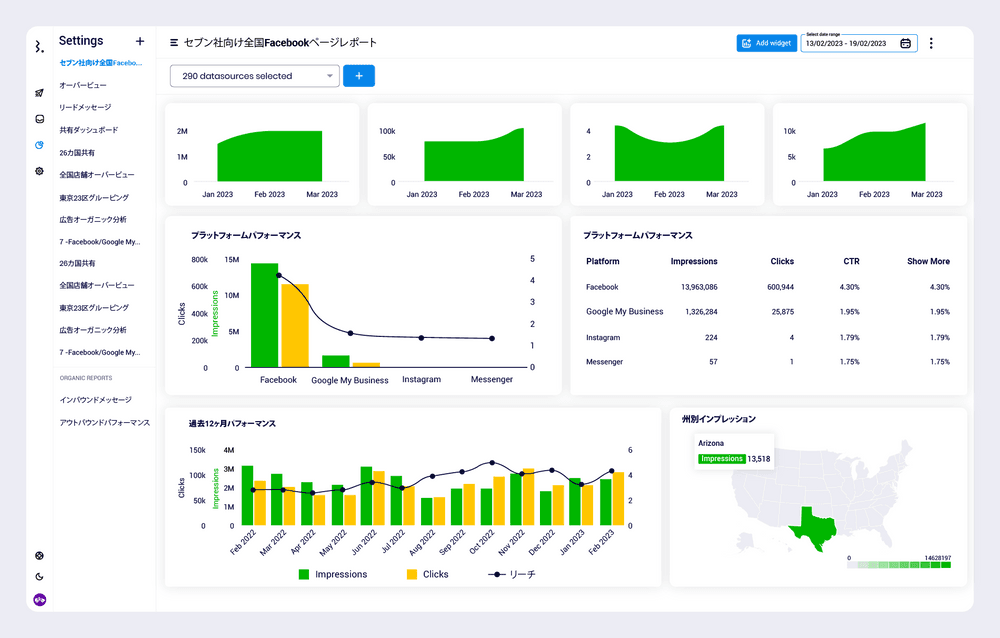 複数の拠点で店舗運営に伴うソーシャルメディアマーケティングを展開している場合、各ネイティブのプラットフォームに手動で入って個別にデータを抽出するのではなく、すべてのマーケティングプラットフォームから同時に自動的にデータを取り込むことができます。