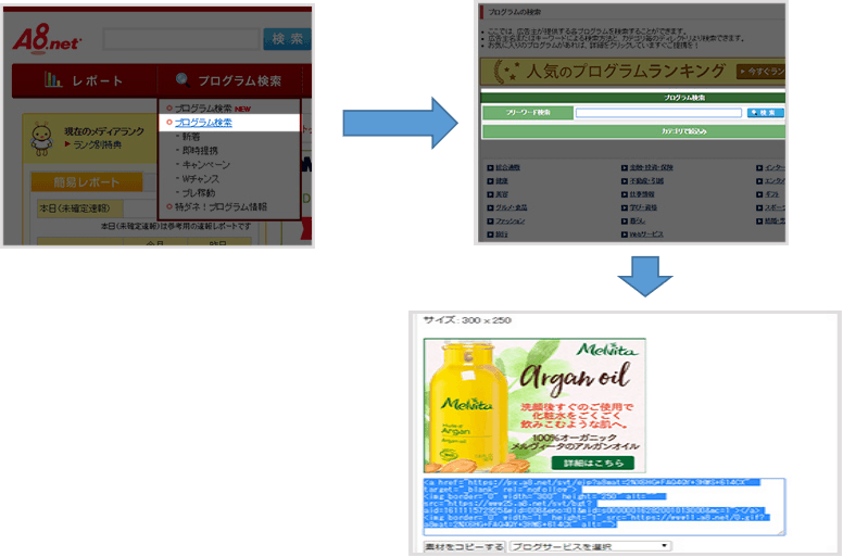 アフィリエイト方法は、まずメニューバーのプログラム検索から、紹介したい商品を検索して選びます。その後、自身のブログで商品紹介の記事を書いてリンクを貼ります。あとは、そのリンクから誰かが紹介した商品を購入すれば、報酬が最短で翌々月に支払われます。