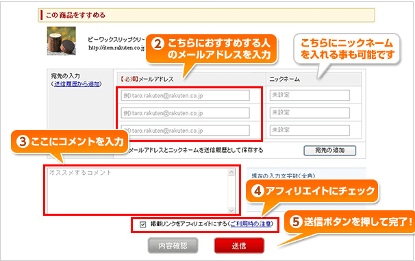 友人などに楽天の商品のアフィリエイトURLを送り、メール受信者がそのリンクから買い物をすることで報酬が発生します。「友達にメールですすめる」ボタンを押して、先ほどと同じくアフィリエイトにチェックを入れて送信すれば完了です。