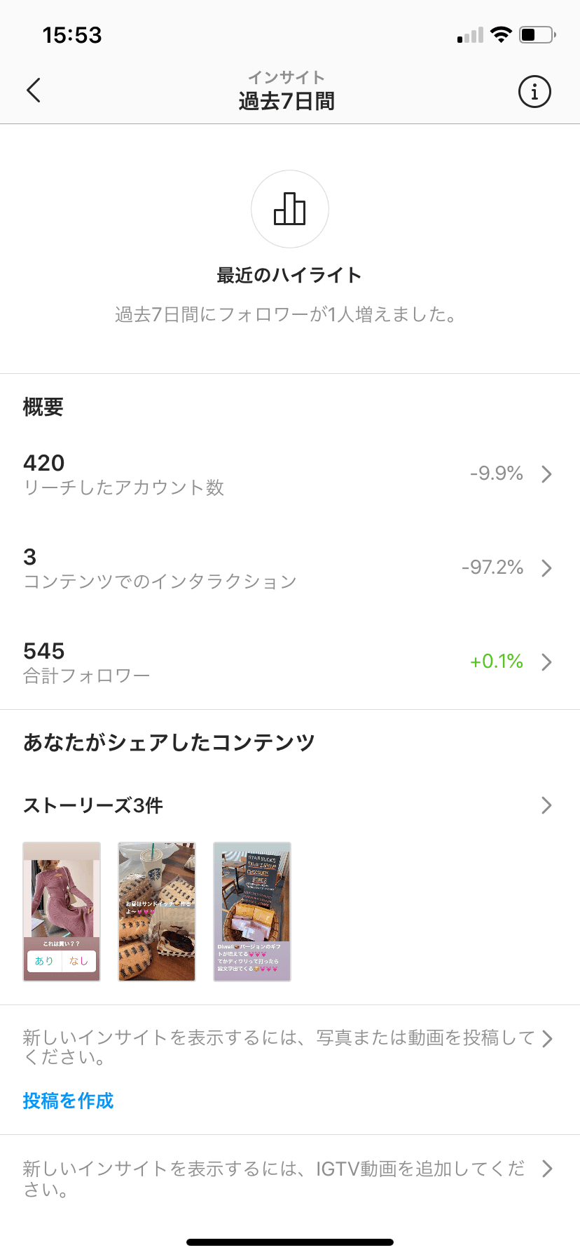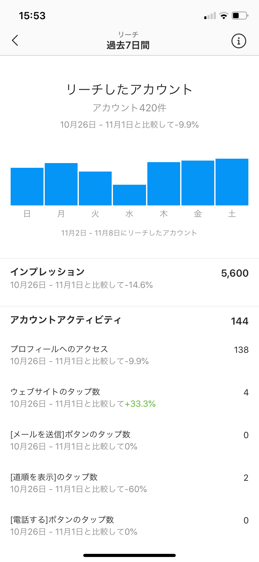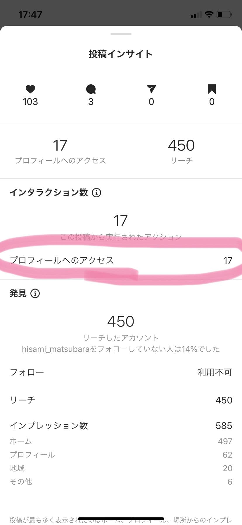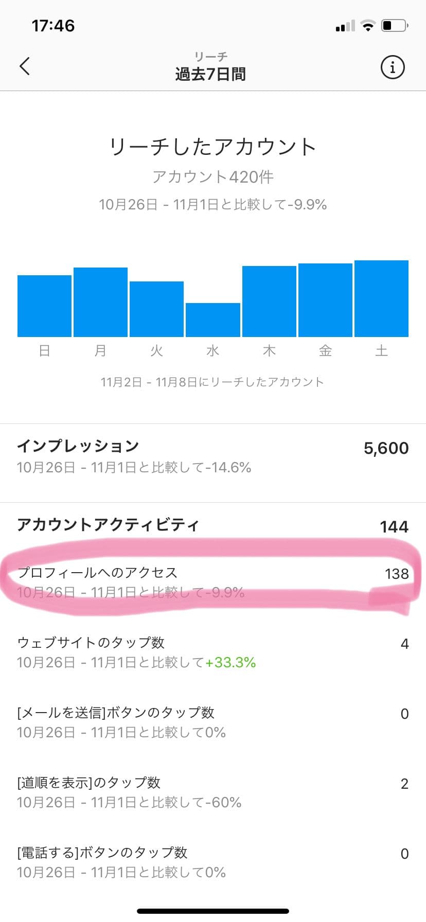 これは、Instagramプロファイルへの訪問数です。これはInstagramインサイトの一週間のうちのリーチした人数と、投稿インサイトの中にもあります。 訪問数の違いを毎週比較するため、KPIシートやレポートを作成しているようであれば訪問数も追跡しましょう。 このように、一週間の合計のプロファイルへのアクセスを確認すると同時に、どの投稿からのアクセスが多かったかも考察しましょう。