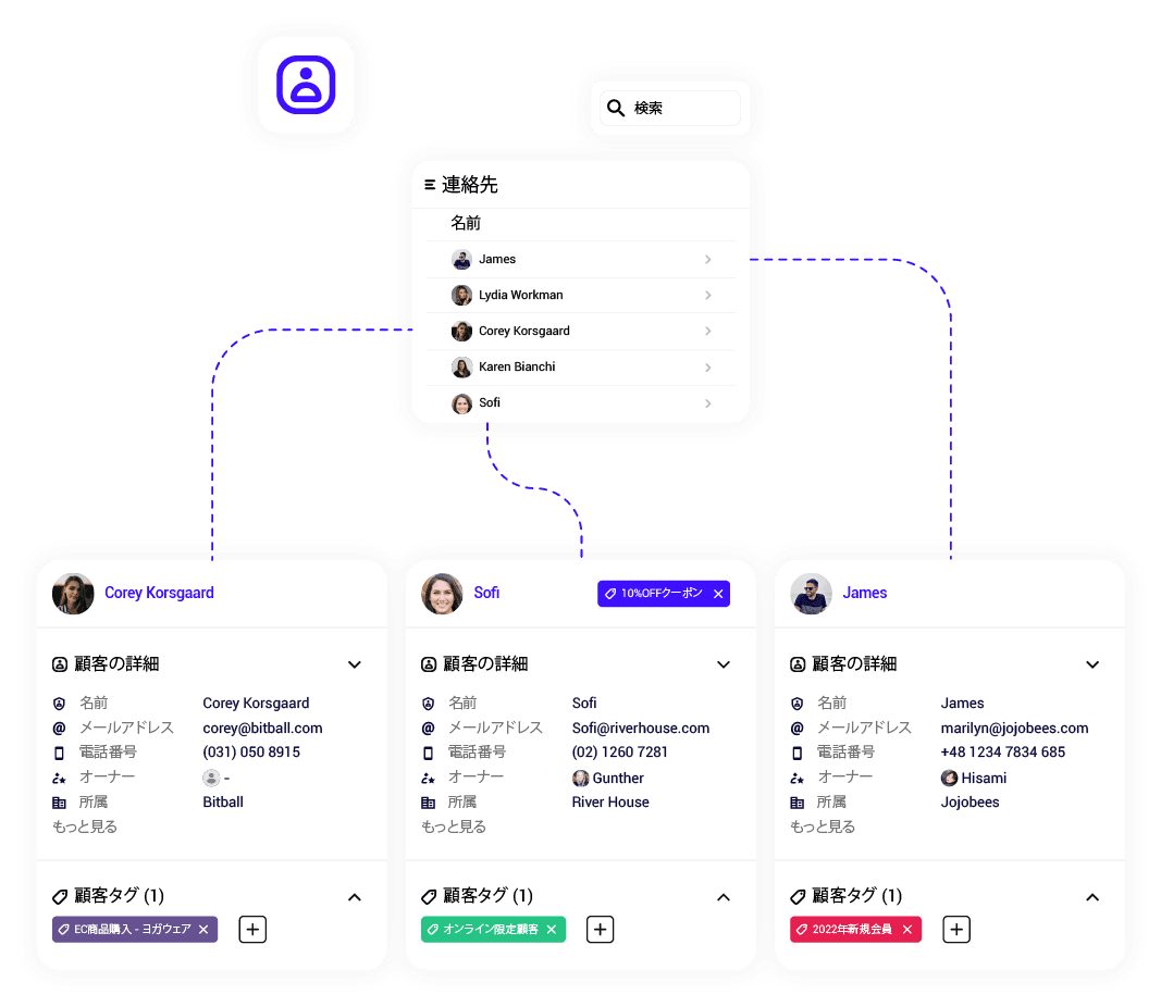 それだけではなく、より「データベースに沿ったメッセージマーケティング」にフォーカスします。CRMツールを使い、ユーザーをラベルごとにカテゴライズしたり(このユーザーは新規顧客かどうか、前回クレームをもらった、など) 、 購入した商品や時期、利用したキャンペーン、アンケートで答えてもらった内容を全て顧客情報として反映させ、セグメント化したオーディエンスにのみメッセージを投下します。