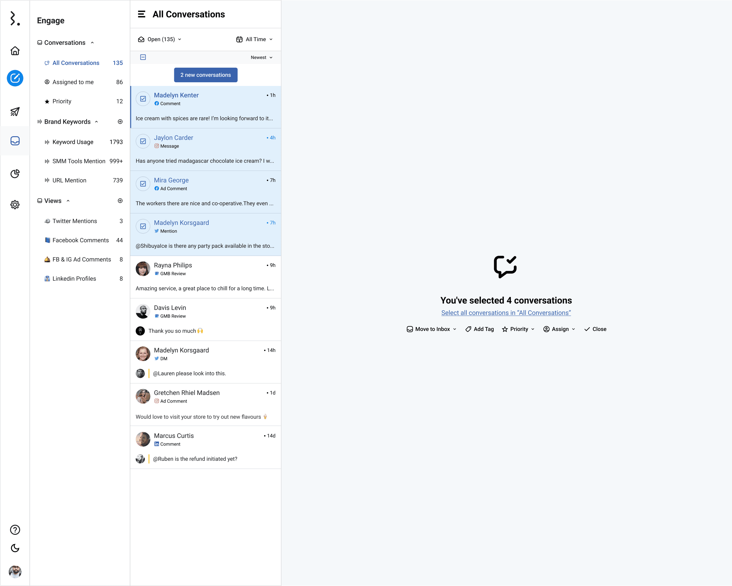 一気にチケットの処理ももちろん可能です。このエンゲージ機能はTwitterでカスタマーサポートを行う企業様のためにメインに設計しています。