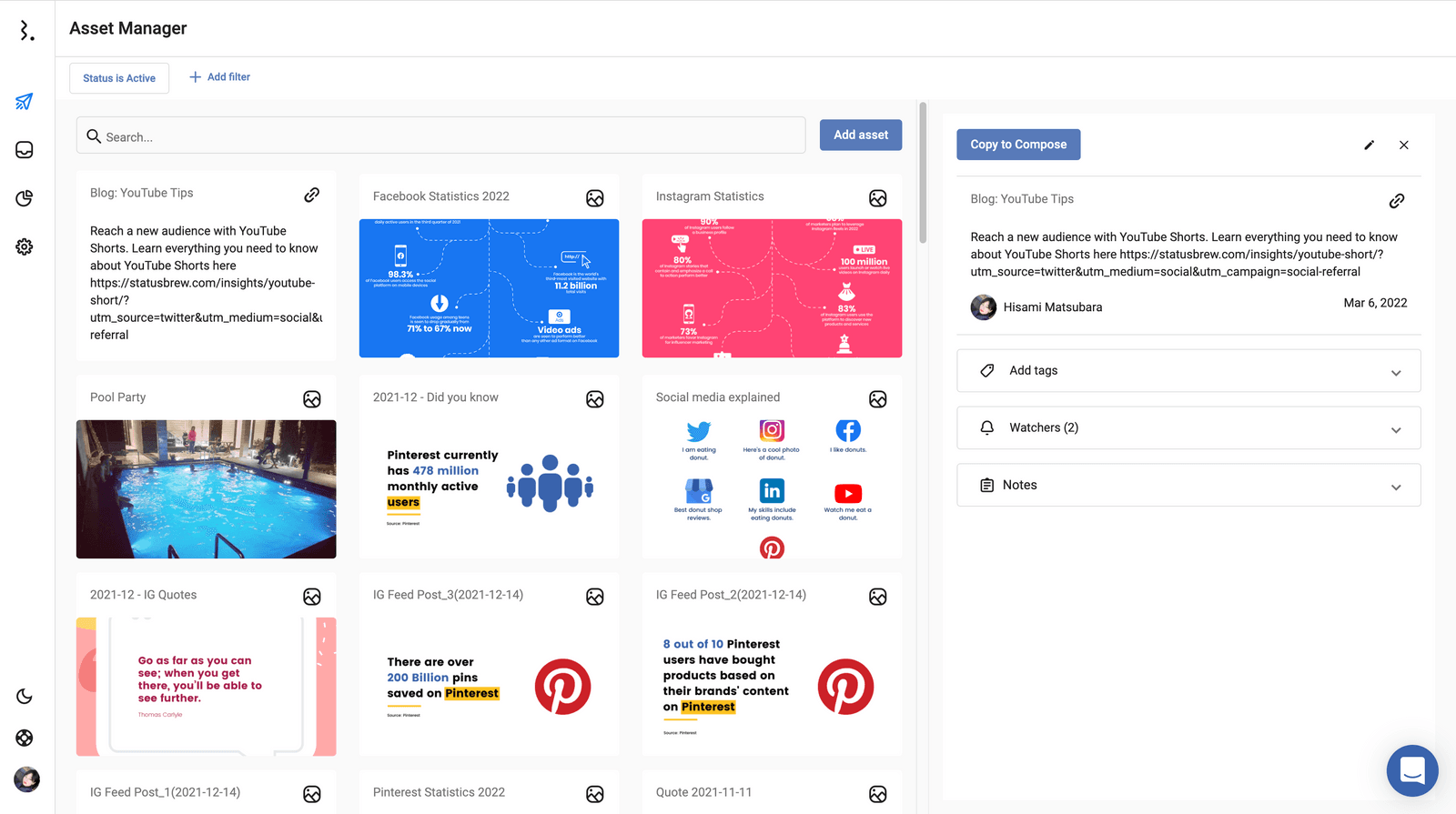 ツイートがストック型の場合、少し編集するだけですぐ複製しつつ繰り返し投稿したい場合は、テンプレート化ツールであるStatusbrewのアセットマネージャーを使います。
