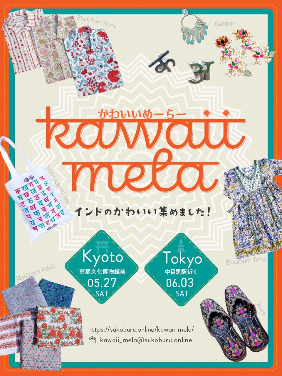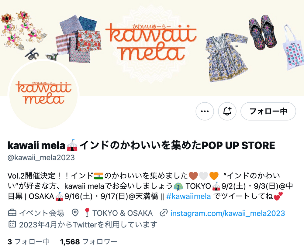 今回事例として取り上げるのは、kawaii mela(読み方:かわいいめーらー)というインドからアパレル雑貨ブランドを集めたポップアップと主催者様です。ちなみにMela(メーラー)とはヒンディー語で遊園地を指す言葉で縁日やお祭り(Festival)を意味するそうです。繊維業や伝統工芸でも多様性に富むインドで主催者が「Kawaii(可愛い!)」と胸を打たれたものだけを日本に持ってくる、をコンセプトにしています。