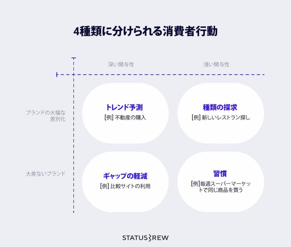 消費行動の種類は4つに分けらると言われています。購買プロセスのあらゆる要素に焦点を当てます。