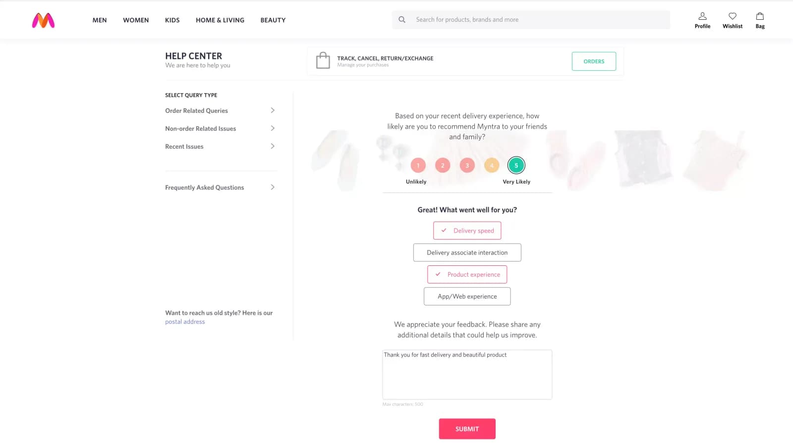 インド最大のファッションEコマースMyntraのフィードバックページ