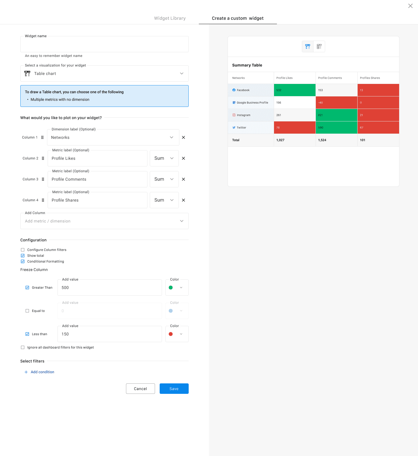 次に完全カスタマイズ機能です。どのような指標を抽出したいか分析指標については把握している、自社のオリジナル分析を1から行いたいけれど、多くのプラットフォームを行き来しデータを集めグラフを作成すると言った重労働を効率化させたい、自社特有の分析指標で分析レポート作成を行いたい、テンプレート機能に慣れてきてより細かな数値を抽出し綿密な戦略を立てたいと言った際に活躍する、1から分析レポートを作成することができる機能です。